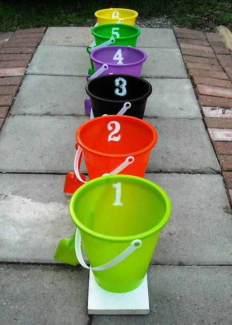 Use your wonderful imagination! How do you want to play it? Let the kids throw things into the buckets... (Spiders, bats, bones etc. get them at the dollar store) then add up the numbers on the buckets that he actually got something in. The one with the highest numbers wins the game? Find out how this game was put together CLICK HERE