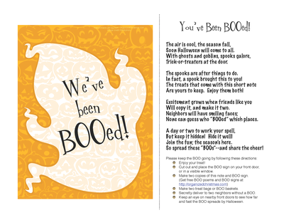 This Boo stuff is really big up here. We did this all last year. Got Boo'd a couple of times with different Boo's. It's fun for the kids. :)